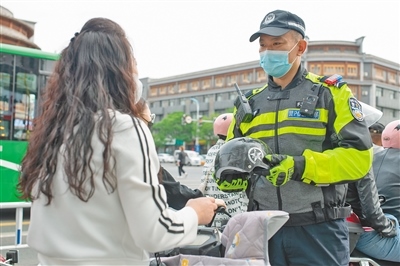 袁超勸導(dǎo)騎行電動車的市民佩戴頭盔