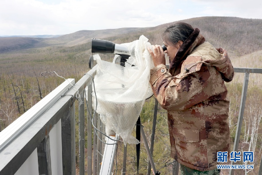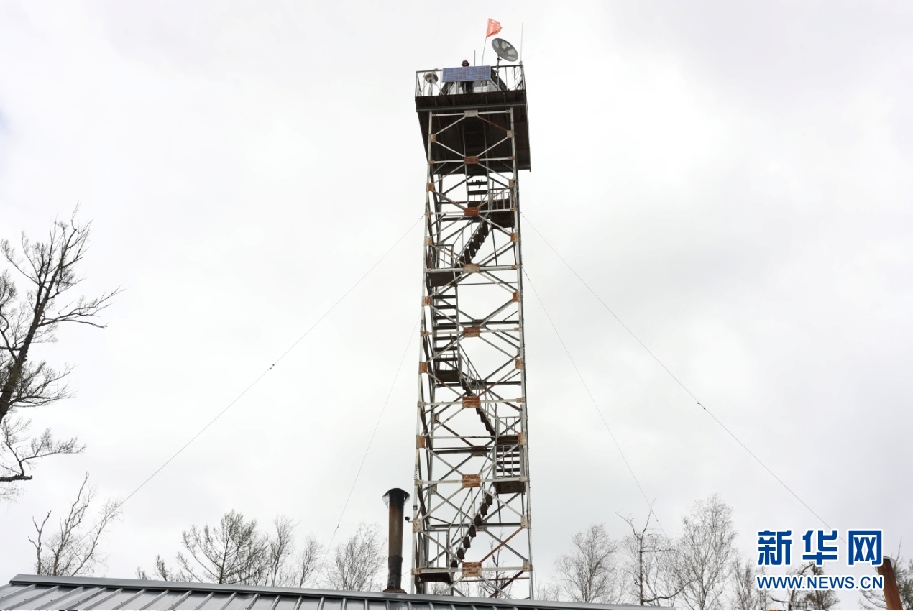 5月11日,57歲的森防瞭望員周桂波站在22米高的瞭望塔上,穿著棉襖棉褲頂著寒風瞭望、匯報、記錄。新華網(wǎng)發(fā)(欒維敬 攝)