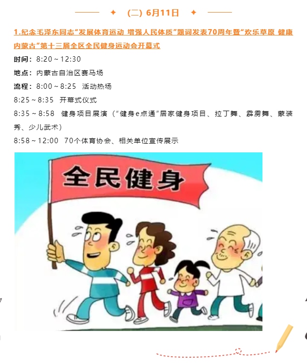 記者從自治區(qū)體育局獲悉,紀(jì)念毛澤東同志“發(fā)展體育運動,增強人民體質(zhì)”題詞70周年暨“歡樂草原健康內(nèi)蒙古”第十三屆全區(qū)全民健身運動會將于6月10日至11日歡樂開啟。