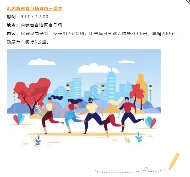 本次運動會認(rèn)真踐行“以人民為中心”辦賽理念,創(chuàng)新探索聚集少、規(guī)模小、符合大眾運動口味的內(nèi)蒙古賽馬場城市三項賽,包含跑步3000米、跳繩200個和動感單車騎行5公里3個項目比賽。此外,還將舉辦公園系列挑戰(zhàn)賽、“跑遍青城”系列路跑活動等,讓群眾在暢享運動的過程中盡情領(lǐng)略城市綠景的清新曼妙,進一步推動全民健身與全民健康深度融合。