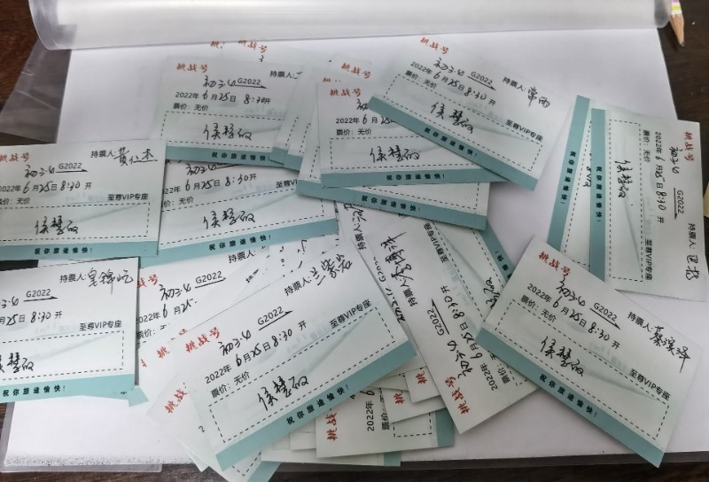 6月20日,呼和浩特市第五中學初三(4)班班主任侯慧敏老師給班里57名學生的手寫“告別信”刷屏朋友圈,紙短情長,愛意滿滿。每封信箋做成車票的樣式,正面寫著車次:“挑戰(zhàn)號”G2022;時間:2022年6月25日8時30分;座位:至尊VIP專座;票價:無價?!敖K點站”并未填寫。侯慧敏說,那是孩子們的夢想,需要靠他們自己來完成。當天的畢業(yè)班會上,當每個學生打開信箋,滿滿的回憶和濃濃的情誼不禁讓孩子們潸然淚下。