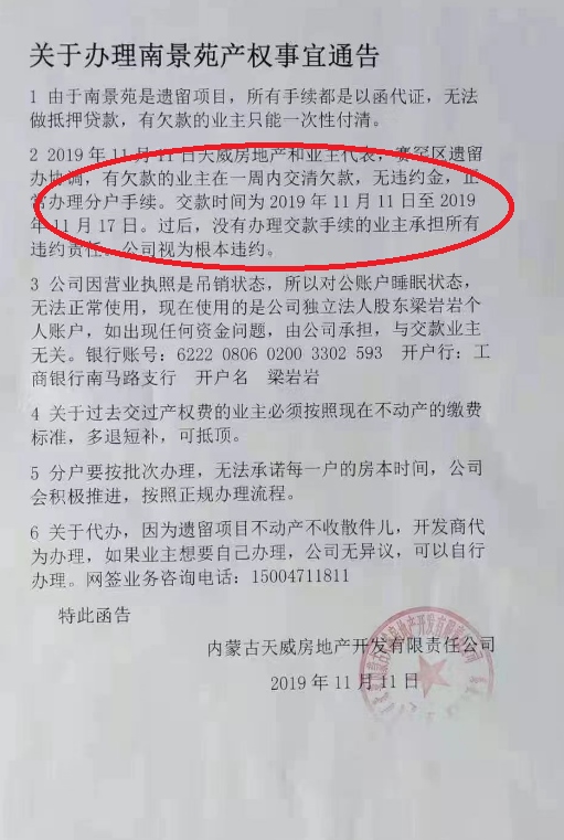 對于賈麗娟的說法,南景苑小區(qū)的居民告訴記者:“2019年11月11日,天威房地產(chǎn)公司曾在小區(qū)張貼過一則關于辦理南景苑產(chǎn)權事宜通告,公告中已經(jīng)明確,2019年11月11日天威房地產(chǎn)和業(yè)主代表、賽罕區(qū)遺留辦協(xié)調,有欠款的業(yè)主在一周內交清欠款,無違約金,正常辦理分戶手續(xù)。這充分說明了我們不需要在交納違約金暨滯納金,賈麗娟所說的滯納金明顯與當年的通告內容相違背。再說,天威房地產(chǎn)公司營業(yè)執(zhí)照處于吊銷狀態(tài),好多地方存在違約行為,按合同約定公司應該賠償給居民的錢誰來負責?”(北方新報正北方網(wǎng)首席記者 高志華 實習生 張子椒)