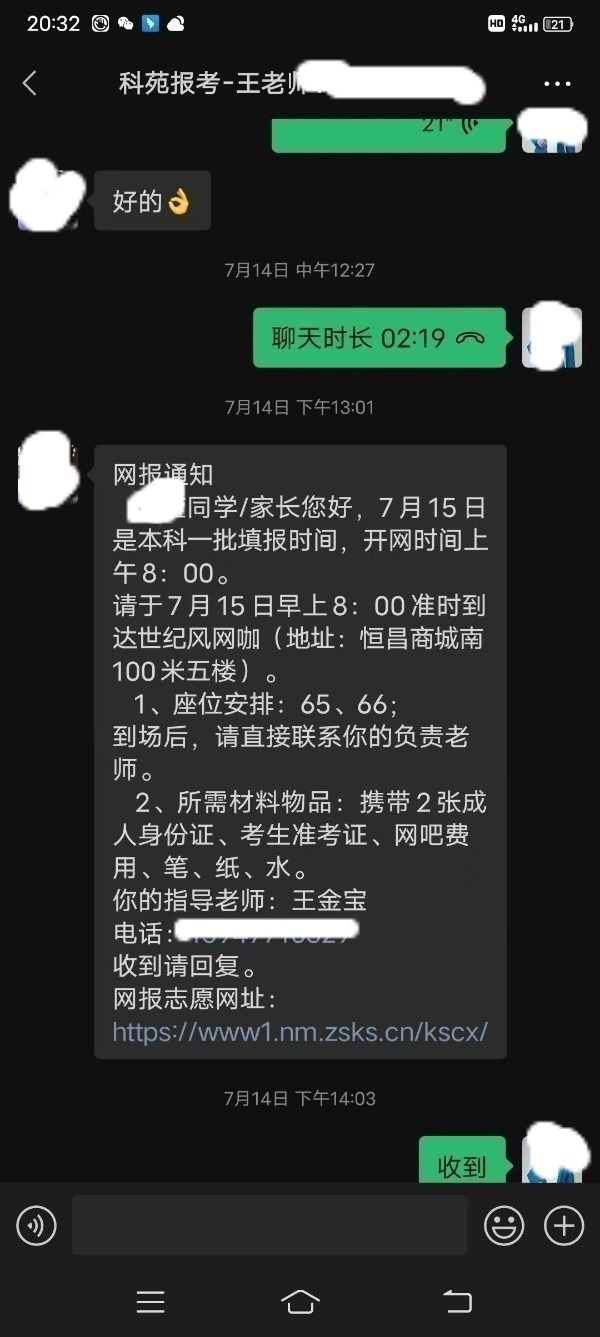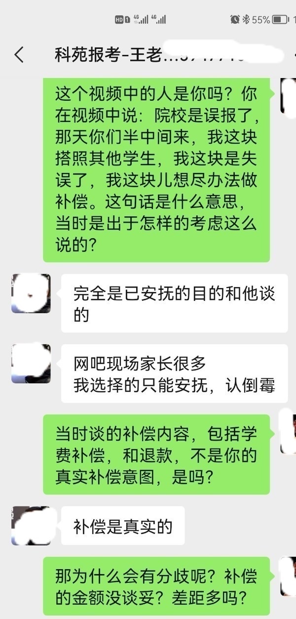 據(jù)樊女士介紹,負(fù)責(zé)給小安報(bào)志愿的是科苑報(bào)考的王金寶老師,也是內(nèi)蒙古科苑信息科技有限公司的股東之一。樊女士提供的視頻顯示,這名老師在網(wǎng)報(bào)志愿現(xiàn)場(chǎng)回復(fù)樊女士:“院校就是誤報(bào)了,因?yàn)槟翘炷銈兪前胫虚g來(lái),還有其他學(xué)生,搭照學(xué)生,我這塊兒就失誤了,我這塊兒想盡辦法做補(bǔ)償?!比欢糠从?,那天以后,這名老師開(kāi)始反口,不承認(rèn)誤報(bào),也不愿意按照當(dāng)天商定的補(bǔ)償方案執(zhí)行。