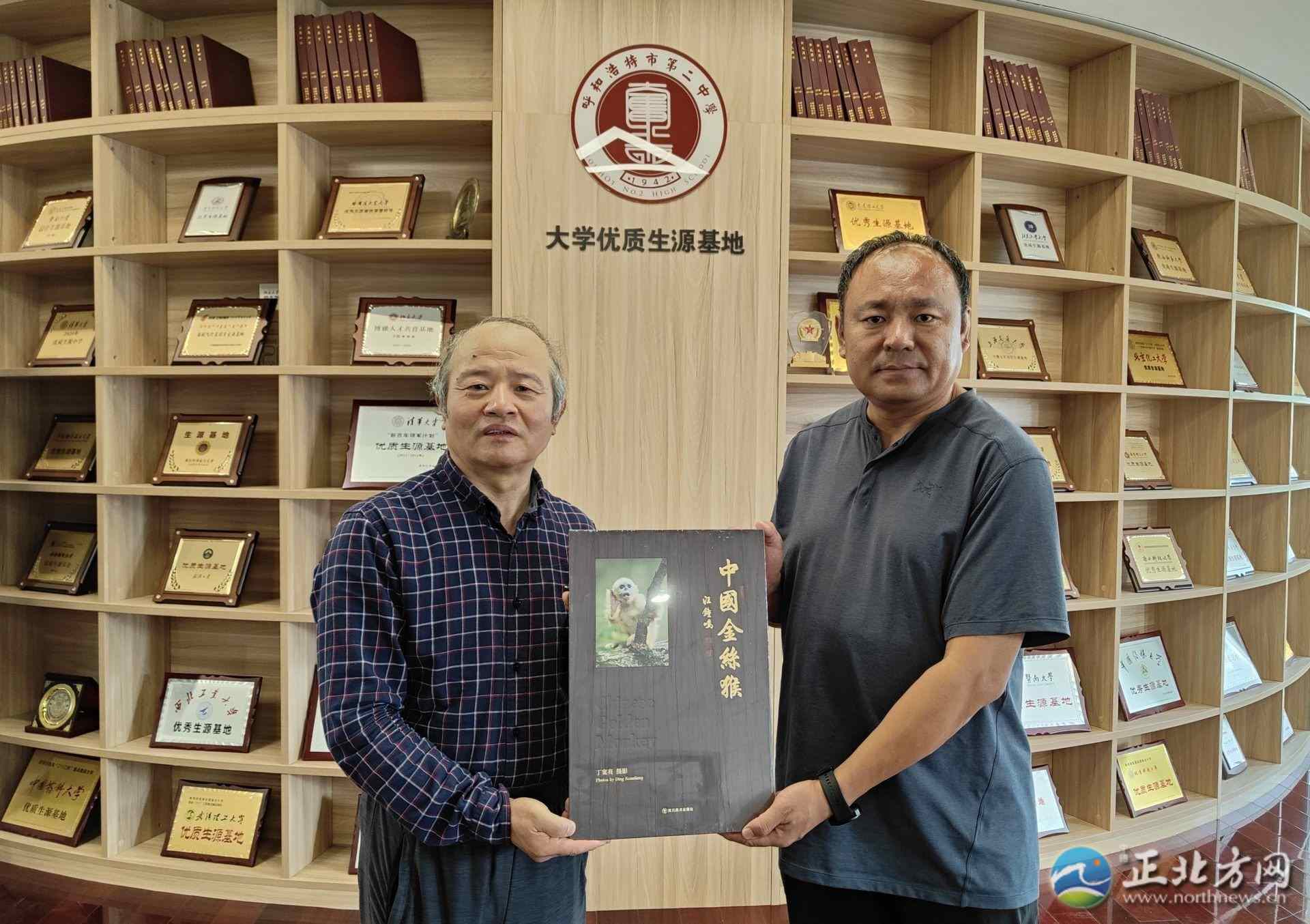 丁寬亮(左)將《中國(guó)金絲猴》捐贈(zèng)呼和浩特市第二中學(xué)
