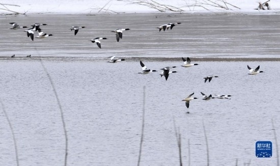 各種鳥類在北京園博湖上棲息、飛翔(2月14日攝)。