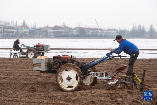 初春時(shí)節(jié),湖北省各地農(nóng)民搶抓農(nóng)時(shí),翻整田地,播種施肥,呈現(xiàn)一派繁忙景象。