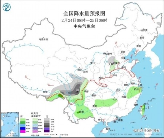 全國降水量預報圖(2月23日08時-24日08時)。圖片來源:中央氣象臺網站