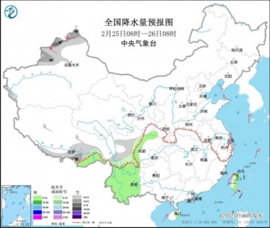 全國降水量預報圖(2月25日08時-26日08時)。圖片來源:中央氣象臺網站