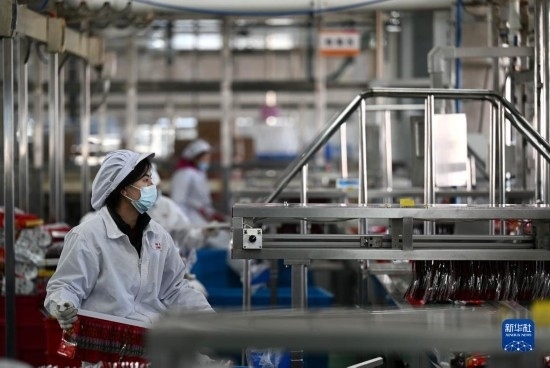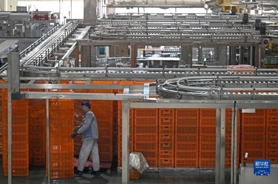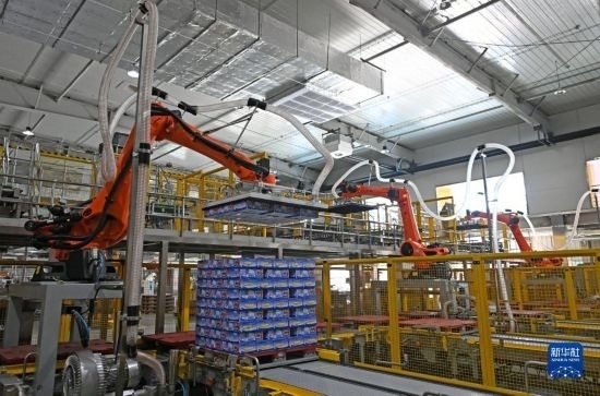 在天津海河乳品有限公司智能化生產(chǎn)線,智能生產(chǎn)設(shè)備在轉(zhuǎn)運(yùn)貨物(2月20日攝)。