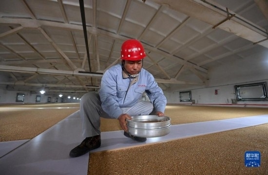 在天津利達(dá)糧油有限公司原糧倉(cāng),工作人員查看糧食儲(chǔ)藏情況(2月23日攝)。