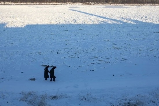 “慢點(diǎn)走,這雪地看著平整,下面還有一層冰。”史先強(qiáng)一邊說一邊攙著沈欣慢慢走。沿著江堤一路下坡,走到頭就是黑龍江,江面中間插著國旗標(biāo)識國界。
