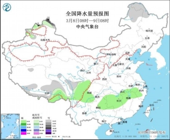 中新網(wǎng)3月6日電 據(jù)中央氣象臺(tái)網(wǎng)站消息,未來三天,四川南部和東部、貴州大部、重慶、云南東部、湖南中北部、湖北南部等地有小到中雨,局地大雨。受弱冷空氣影響,新疆西北部的部分地區(qū)有中到大雪或雨夾雪,局地有暴雪。內(nèi)蒙古東北部、黑龍江北部的部分地區(qū)有小到中雪或雨夾雪,局地有大雪。全國(guó)其余大部地區(qū)天氣晴好,氣溫逐漸上升。