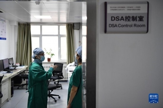 3月7日,馬娜(右)和同事在手術(shù)室為患者進行介入手術(shù)治療。