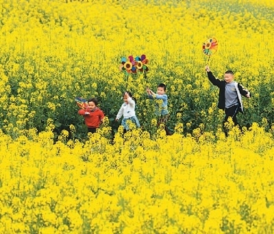 2022年,四川省眉山市仁壽縣謝安鎮(zhèn)扎林村對1200畝撂荒地集中整治,通過集體經濟聯(lián)合社進行統(tǒng)一種植、統(tǒng)一管理,既盤活了閑置土地、讓村民變股民,又讓荒山成景點。圖為3月5日,兒童在扎林村油菜花地里玩耍。 潘 帥攝(人民視覺)