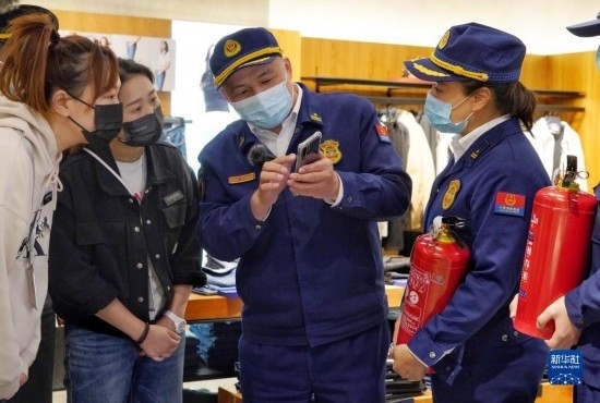 3月14日,消防支隊(duì)防火監(jiān)督員(中)為商場商戶講解如何使用手機(jī)掃碼方式辨別消防產(chǎn)品真?zhèn)巍?/p>