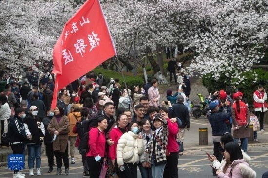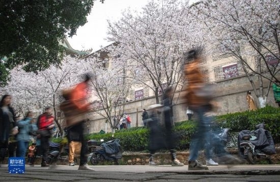 當日,武漢大學(xué)舉行抗疫醫(yī)護賞櫻專場。珞珈山下,來自全國各地的1.6萬余名抗疫醫(yī)護人員及家屬赴約賞櫻。
