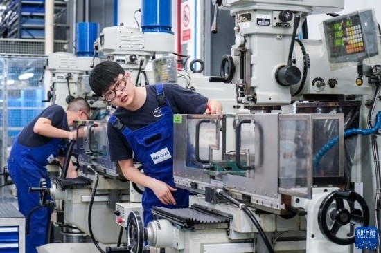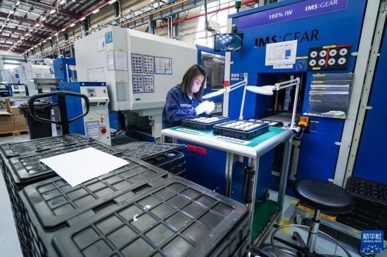 工人在位于太倉(cāng)市高新區(qū)的億邁齒輪(太倉(cāng))有限公司生產(chǎn)車間內(nèi)進(jìn)行加工作業(yè)(3月14日攝)。