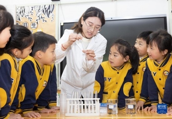 3月22日,在浙江省諸暨市實驗幼兒園,老師帶領小朋友做水樣檢測實驗。