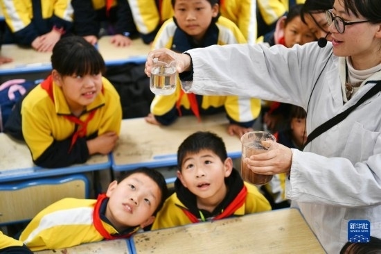 3月22日,在四川省廣安市前鋒區(qū)前鋒小學,老師在向學生展示過濾前后的水質變化。
