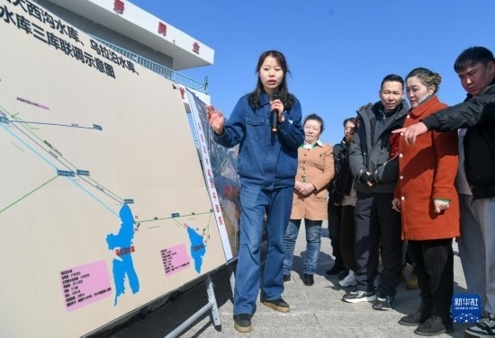 3月22日,在烏魯木齊水業(yè)集團有限公司烏拉泊水庫管理站,工作人員給居民講解烏魯木齊飲用水的來源。
