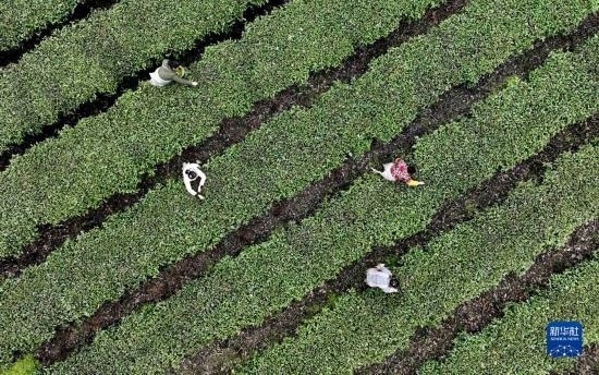 3月21日,在貴州省貴陽(yáng)市開陽(yáng)縣禾豐鄉(xiāng)馬頭村,茶農(nóng)在采茶(無人機(jī)照片)。