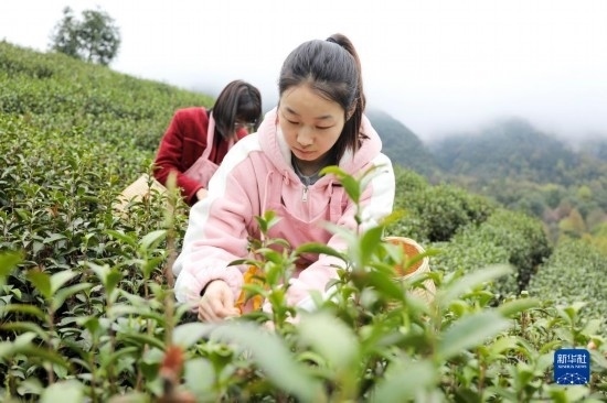 3月21日,茶農(nóng)在貴州省綏陽(yáng)縣小關(guān)鄉(xiāng)大寨村的茶園種植基地里采茶。