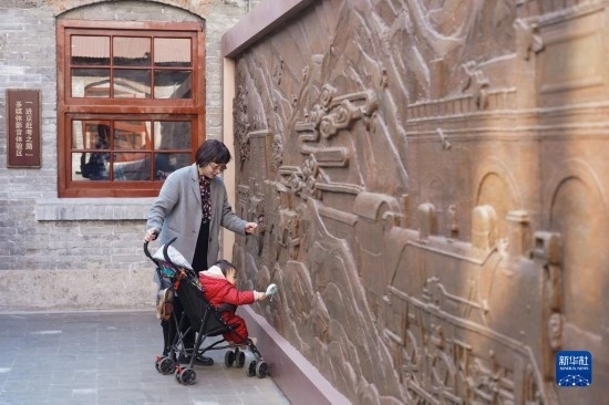 3月25日,一位游客帶著孩子參觀清華園車站舊址內(nèi)的一處浮雕。