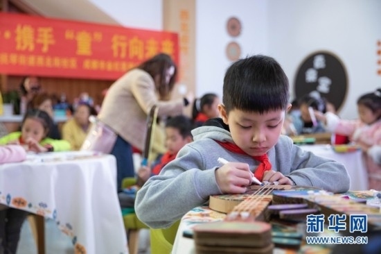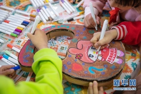 在成都市金牛區(qū)西北街社區(qū)的服務(wù)大廳一角,一群孩子正為紙板制作的各族樂(lè)器繪畫(huà)著色。