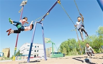 去年以來,甘肅省張掖市民樂縣把生態(tài)及地質(zhì)災(zāi)害避險(xiǎn)搬遷與城鎮(zhèn)化建設(shè)相結(jié)合,推動(dòng)城鄉(xiāng)融合發(fā)展。圖為搬遷到民樂縣樂民新城的孩子們?cè)谛^(qū)內(nèi)玩耍。王 將攝(人民圖片)