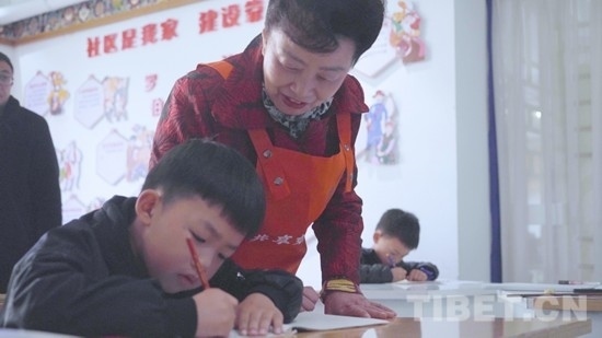 “這一筆要拉長(zhǎng),再拉長(zhǎng),對(duì)不對(duì)!”操著一口四川話的張惠英老人一邊把著孩子的手寫字,一邊微笑耐心地講解。在吉福社區(qū)的一間教室里,十來(lái)個(gè)孩子正在認(rèn)真地練寫漢字筆畫,而教他們書寫的張惠英并不是真正的教師,而是孩子們的“共享奶奶”。