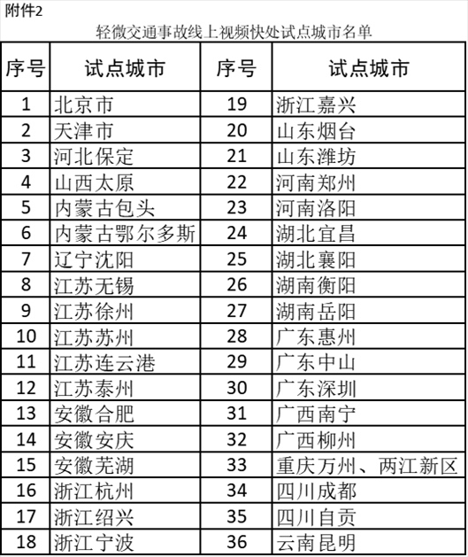 2、輕微交通事故線(xiàn)上視頻快處試點(diǎn)城市名單