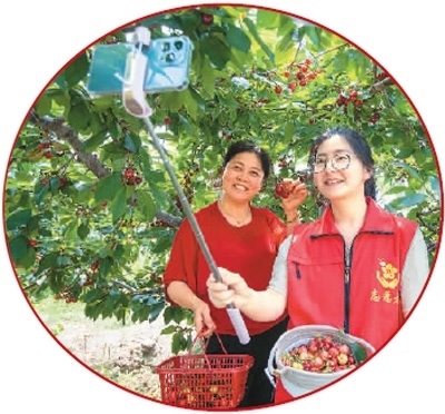 2022年6月8日,江蘇省海安市大公鎮(zhèn)姜橋村一櫻桃種植園內,青年黨員志愿者與農場主一起直播推銷剛剛采摘的櫻桃。 翟慧勇攝(人民視覺)
