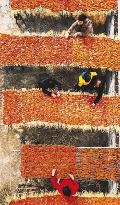 2022年12月16日,湖南省永州市新田縣枧頭鎮(zhèn)大觀堡村,村民在晾曬紅薯干。近年來,該縣利用訂單服務和農村電商平臺,實現(xiàn)農產品線上線下銷售。 劉貴雄攝(人民視覺)