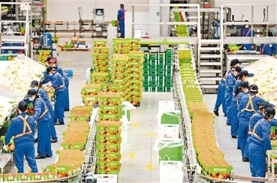 2022年11月27日,江西省贛州市信豐縣高新技術產業(yè)園區(qū)的一家臍橙加工企業(yè),工人在智能分選包裝生產線上篩選裝運臍橙鮮果。 朱海鵬攝(人民視覺)