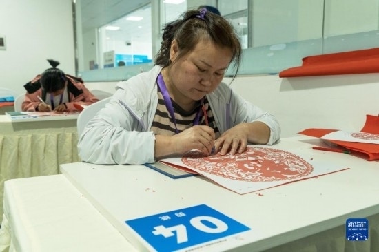 4月12日,在四川省綿陽市公共實訓(xùn)基地,參加剪紙項目的選手正在比賽中。