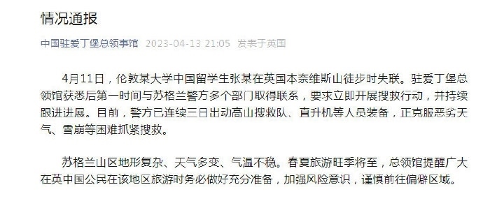 ·一名中國留學生在英國徒步時失聯,中領館:已聯系警方,正抓緊搜救。