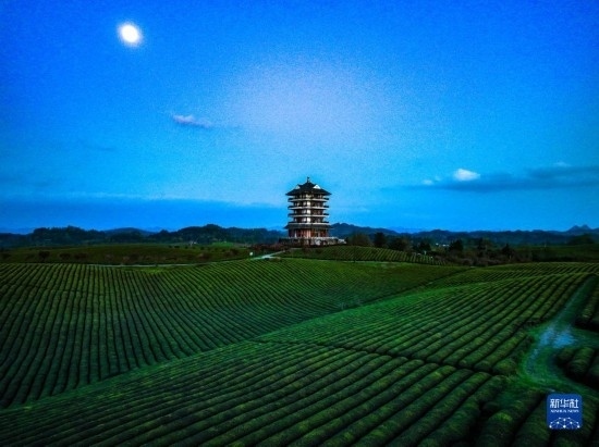 4月4日在遵義市湄潭縣永興鎮(zhèn)拍攝的月光下的“萬(wàn)畝茶?!保o(wú)人機(jī)照片)。