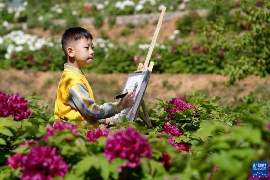 4月16日,小朋友在白臺峪村牡丹農業(yè)產業(yè)園內寫生。