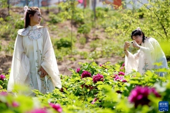 4月16日,游客在白臺峪村牡丹農業(yè)產業(yè)園拍照游玩。