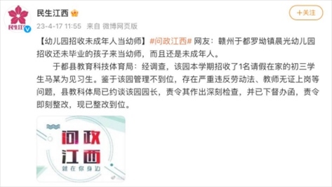 ·贛州于都縣一幼兒園招收初三學(xué)生為見習(xí)生,園長(zhǎng)被約談。