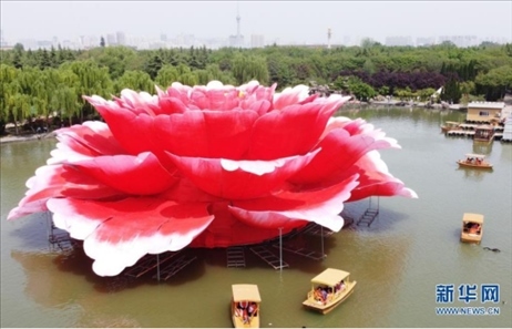 近日,在河南省洛陽(yáng)市隋唐城遺址植物園,一座直徑36米、高13米的巨型牡丹景觀造型亮相滴翠湖,吸引游客前來觀賞。