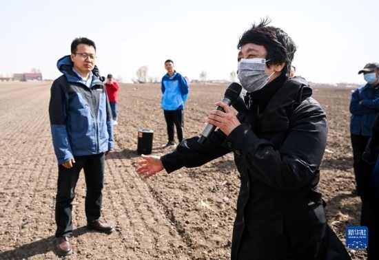 4月17日,在通遼市科爾沁左翼中旗腰林毛都鎮(zhèn),科爾沁左翼中旗農(nóng)技推廣中心主任梅園雪向種植戶推廣介紹密植滴灌高產(chǎn)技術。