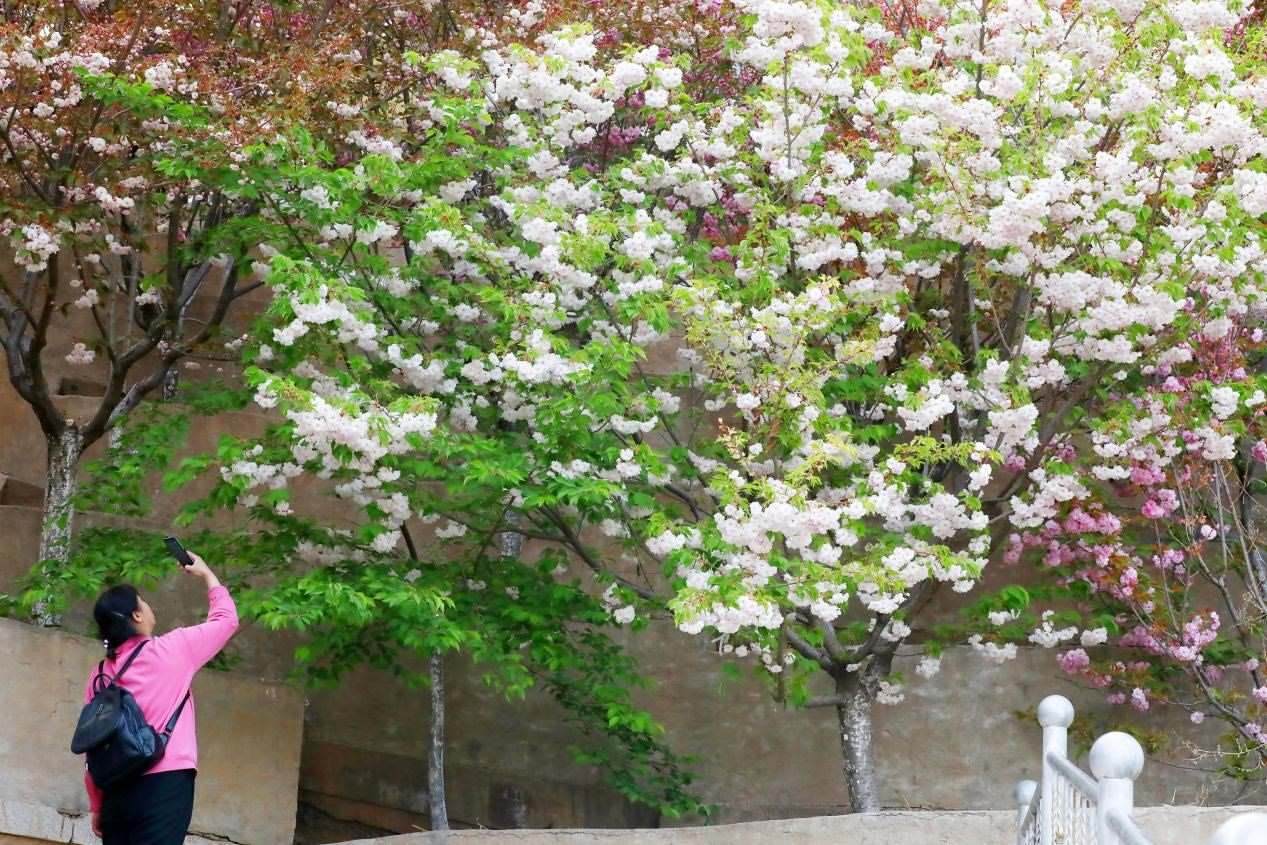 櫻花園里,各類櫻花搖曳生姿,爭(zhēng)相怒放,景色宜人,構(gòu)成一幅幅明麗的春日畫圖。前來(lái)觀賞的游客紛紛在櫻花樹下拍照打卡。
