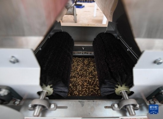 4月20日,在彭山區(qū)公義鎮(zhèn),智能水稻育秧播種流水線將種子播種到育秧盤(pán)內(nèi)。