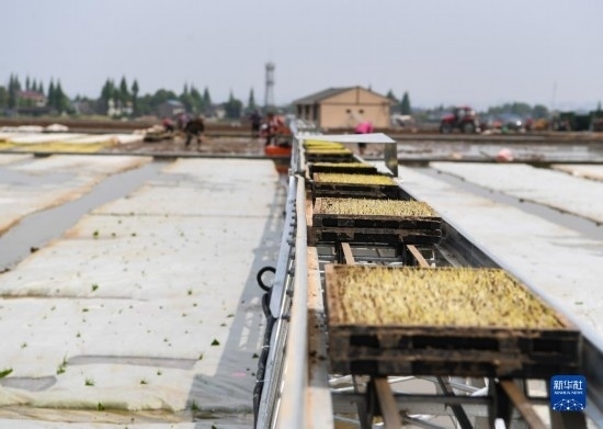 4月20日,在彭山區(qū)公義鎮(zhèn)的數(shù)智水稻示范基地,工人在秧盤(pán)智能傳輸帶上轉(zhuǎn)運(yùn)育秧盤(pán)。