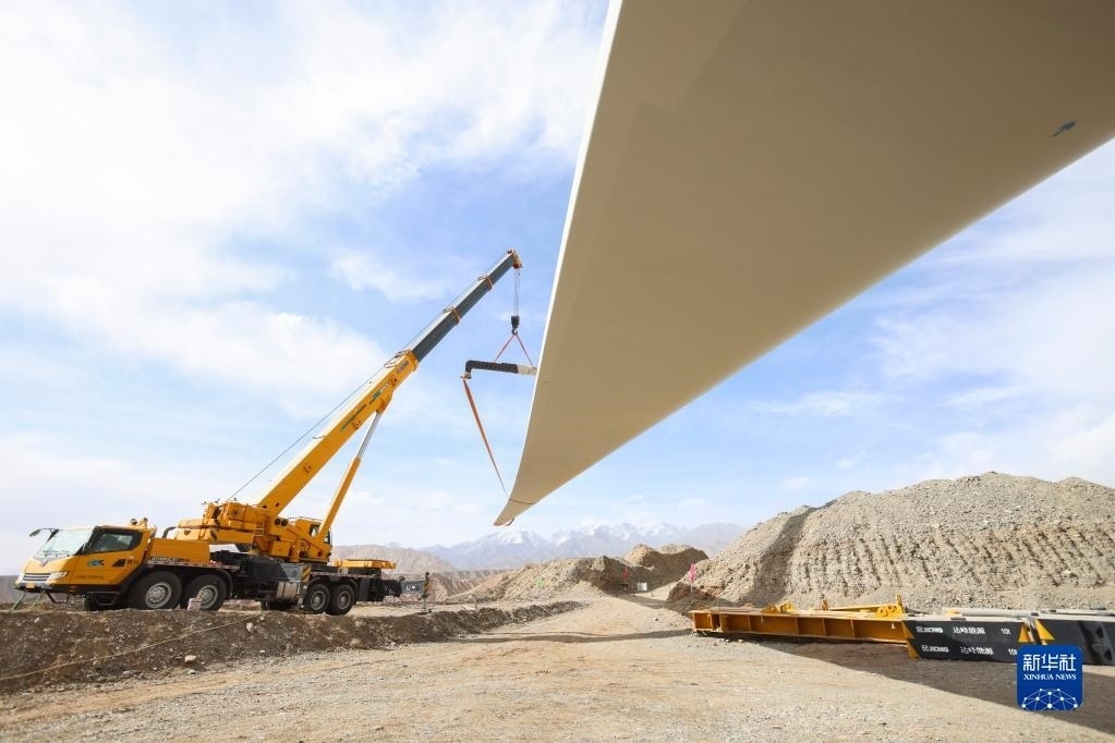 在新疆克孜勒蘇柯爾克孜自治州烏恰縣,風(fēng)機(jī)葉輪提升至相應(yīng)高度后與機(jī)艙對(duì)接(4月21日攝)。