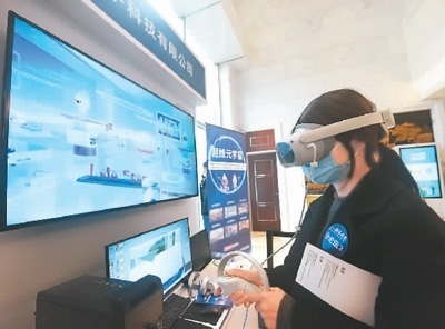 3月16日,在浙江省杭州市2023西溪大會·全球數(shù)字科技峰會上,虛擬現(xiàn)實(shí)產(chǎn)品設(shè)計(jì)師利用VR技術(shù)探索“超維元宇宙”。龍 巍攝(人民視覺)