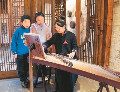 4月9日,在安徽省黟縣石亭村的民宿“拾庭畫驛”內(nèi),民宿管家在為小朋友演奏傳統(tǒng)樂器。新華社記者 馬 寧攝