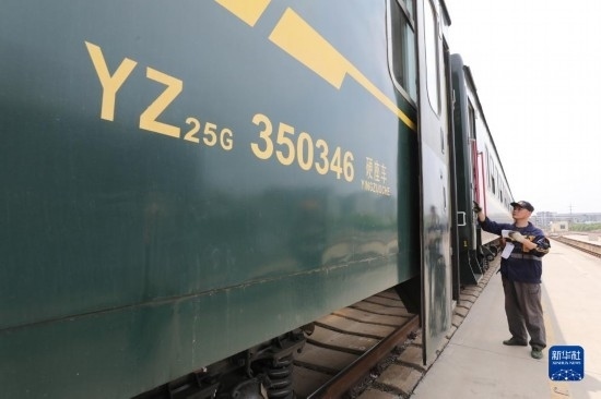 4月28日,中國(guó)鐵路上海局集團(tuán)有限公司徐州站的鐵路連結(jié)員在對(duì)臨時(shí)旅客列車(chē)進(jìn)行拉風(fēng)作業(yè)(無(wú)人機(jī)照片)。