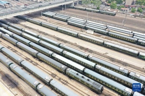 4月28日拍攝的中國(guó)鐵路上海局集團(tuán)有限公司徐州站客車(chē)整備場(chǎng)內(nèi)的臨時(shí)旅客列車(chē)(無(wú)人機(jī)照片)。